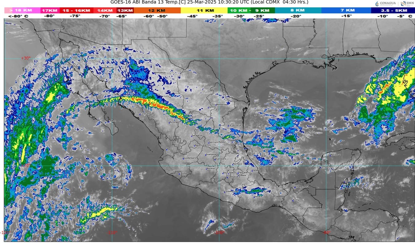 Una circulación anticiclónica en niveles medios de la atmósfera y el escaso contenido de vapor de agua mantendrán la baja probabilidad de lluvia en el noroeste, norte, occidente y sur de México, así como ambiente cálido a caluroso sobre gran parte de la República Mexicana.