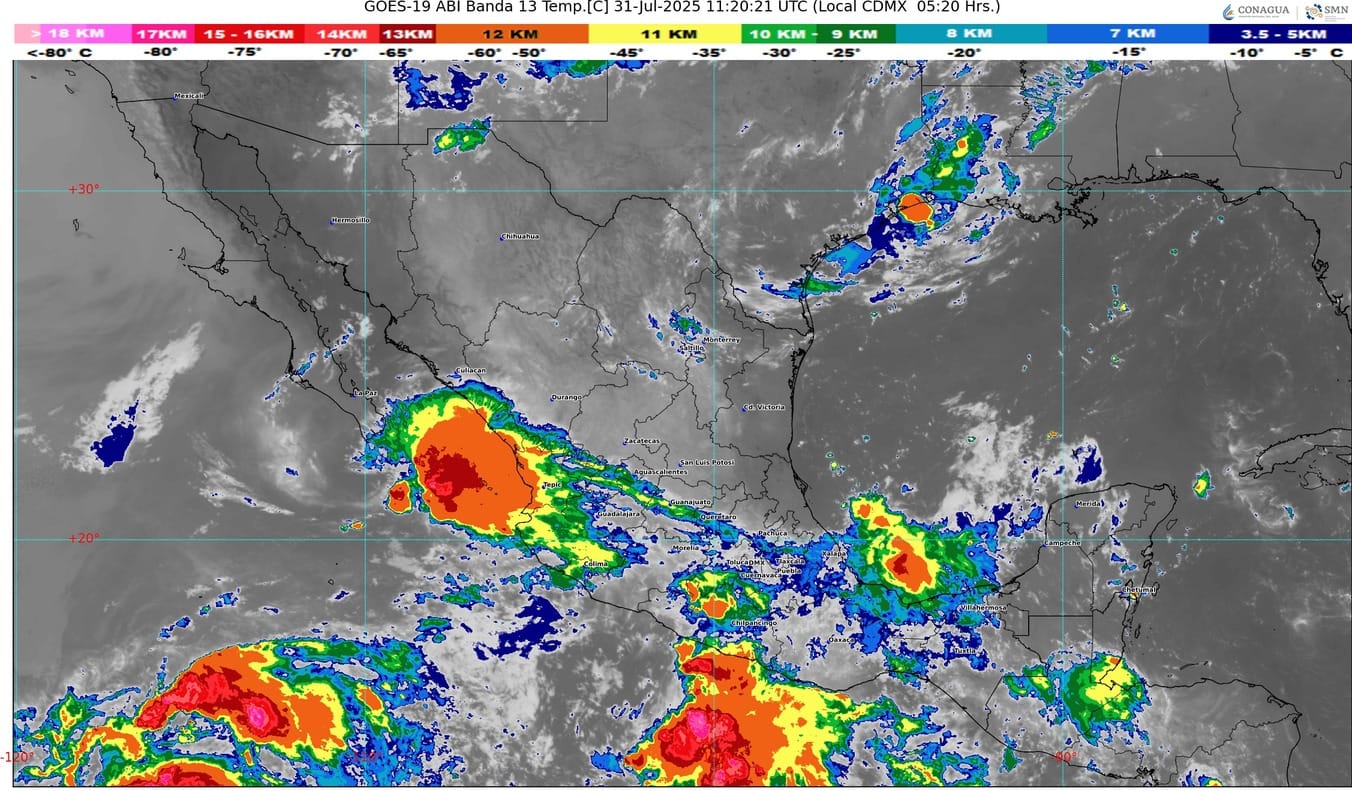 A su vez, el monzón mexicano en combinación con inestabilidad y una circulación ciclónica en niveles altos de la atmósfera, localizada al suroeste de Baja California Sur, generarán chubascos y lluvias fuertes con descargas eléctricas en el noroeste de México.