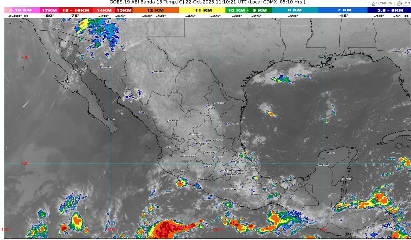 Otro canal de baja presión sobre el interior del territorio nacional, en combinación con el ingreso de humedad del océano Pacífico y golfo de México, ocasionarán lluvias y chubascos en estados del norte, occidente, centro y sur de México.